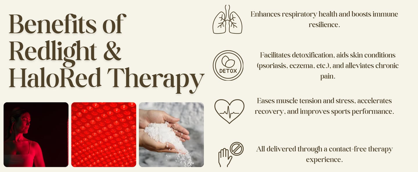 HaloRed Therapy combines full-body red and near-infrared light with the added benefits of salt-infused air to create a deeper, more restorative wellness experience. This unique combination supports recovery while promoting relaxation, clearer breathing, reduced stress, and whole-body balance—all in one calming session.